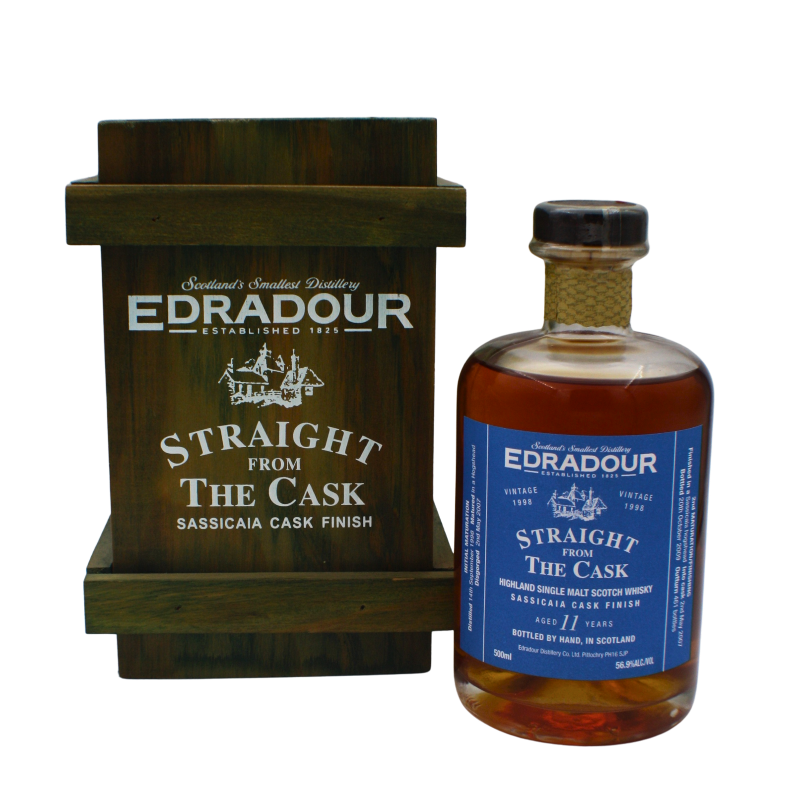 Edradour Distillery located in Pitlochry Perthshire has been under the ownership of the Signatory Vintage Scotch Whisky Company since 2002. This 11-year-old expression was distilled on September 14 1998 initially matured in a hogshead oak cask and then finished for around six months in Sassicaia wine casks. It was bottled on Octomber 20 2007 with only 461 bottles released worldwide.