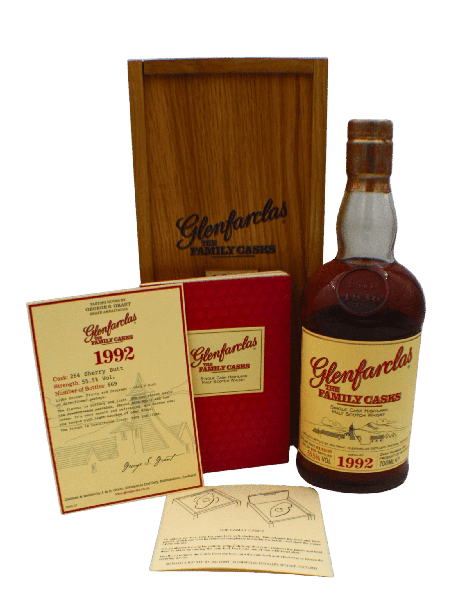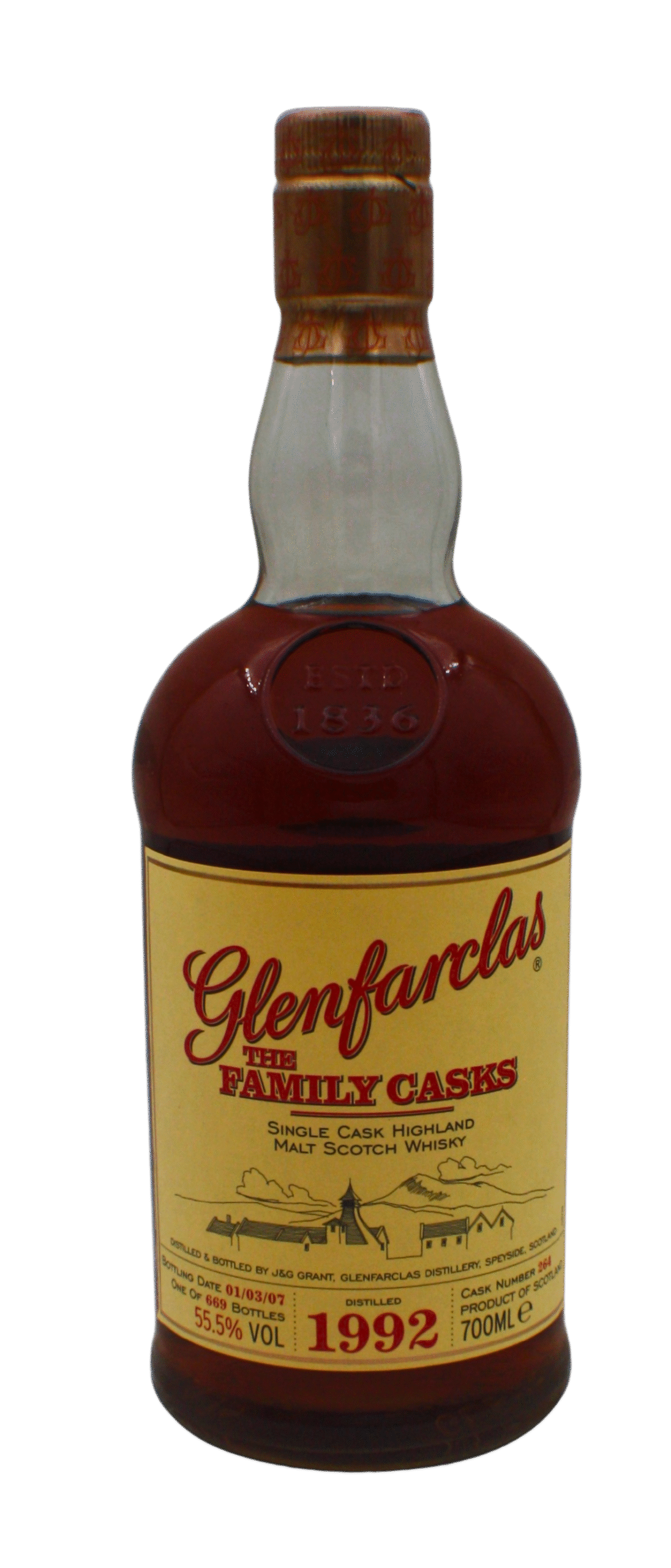 The Glenfarclas Family Cask 1992 is a rare limited-edition whisky aged for 15 years in a single sherry butt (cask #264) and bottled in 2007 with only 669 bottles available globally.