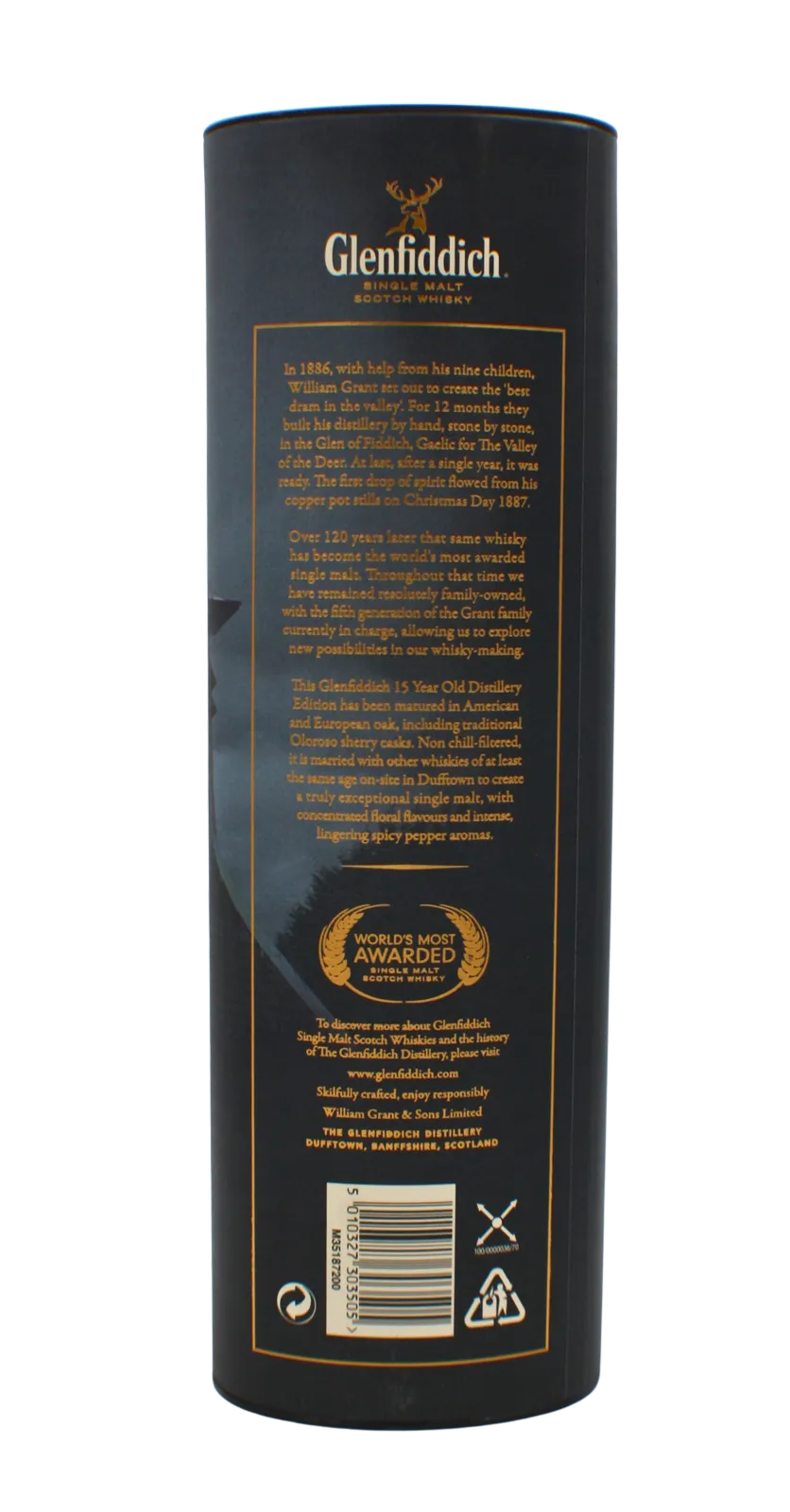 Released in 2021 exclusively for travel retail this cask strength Glenfiddich 15 Year Old Distillery Edition was aged in a combination of traditional European oak and American oak casks.