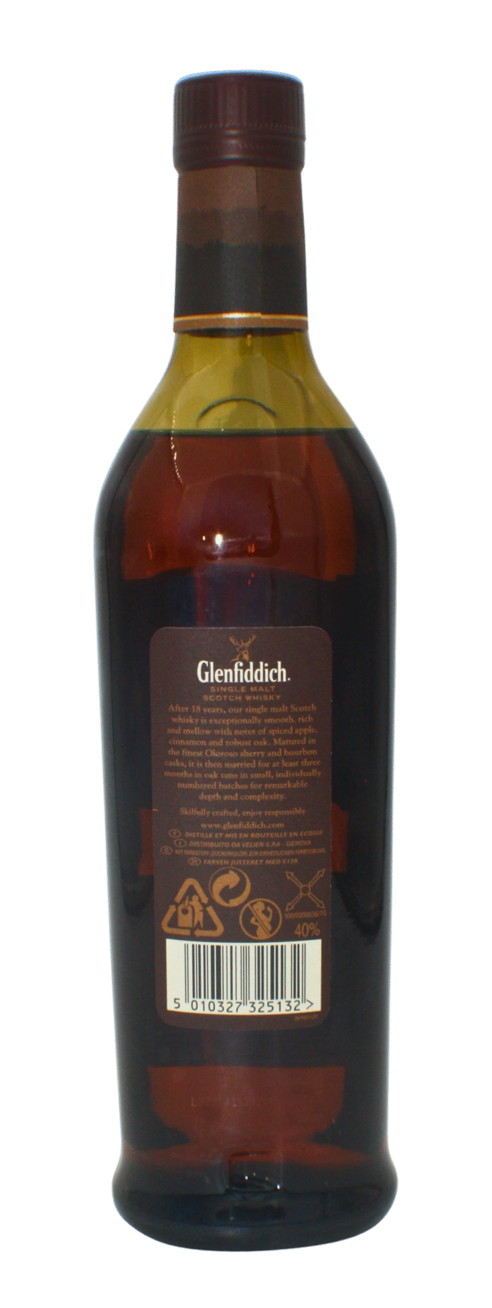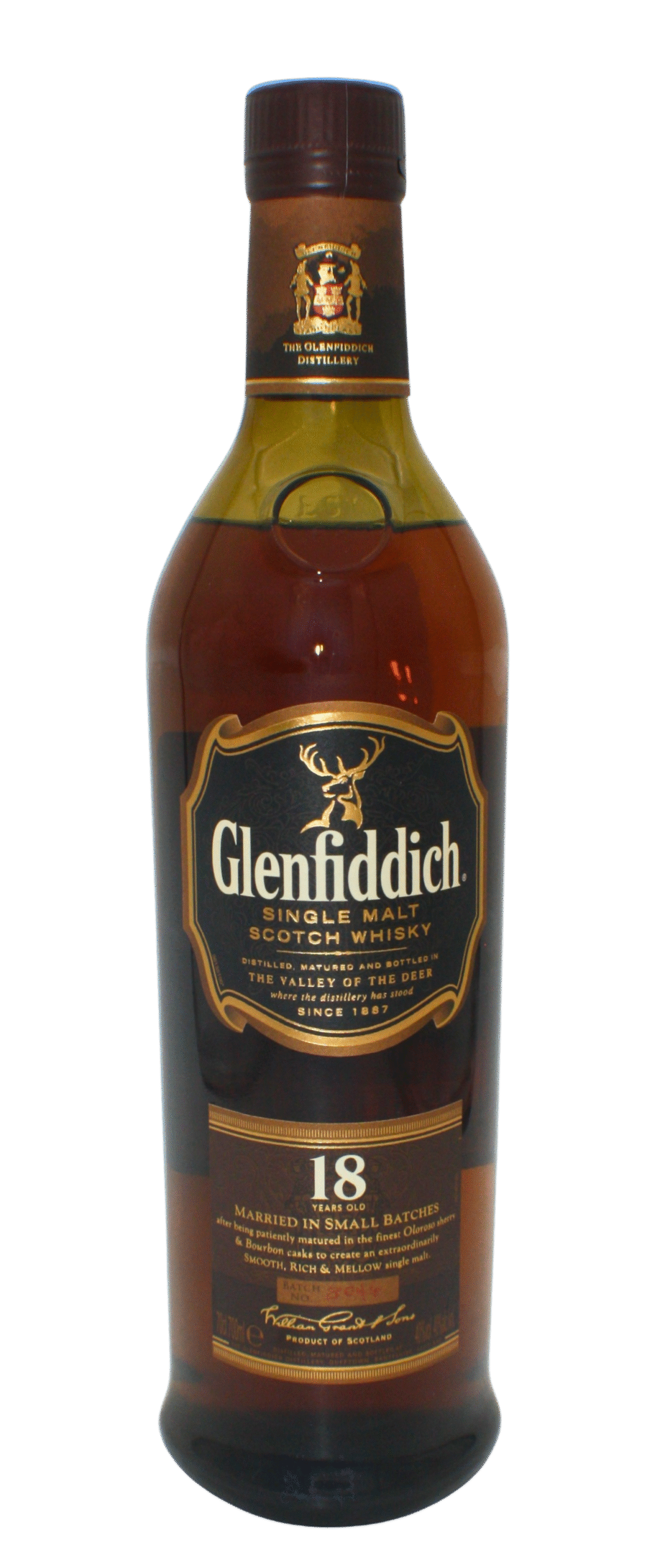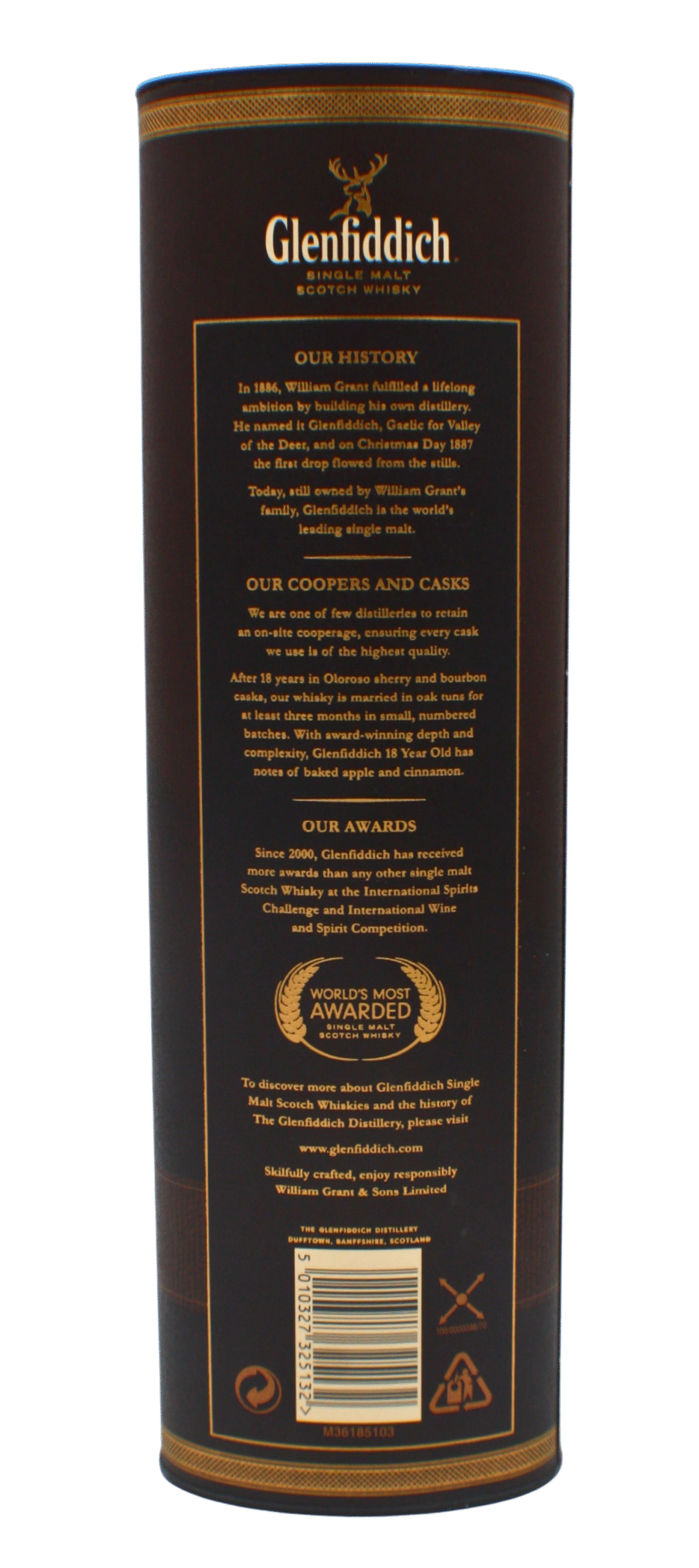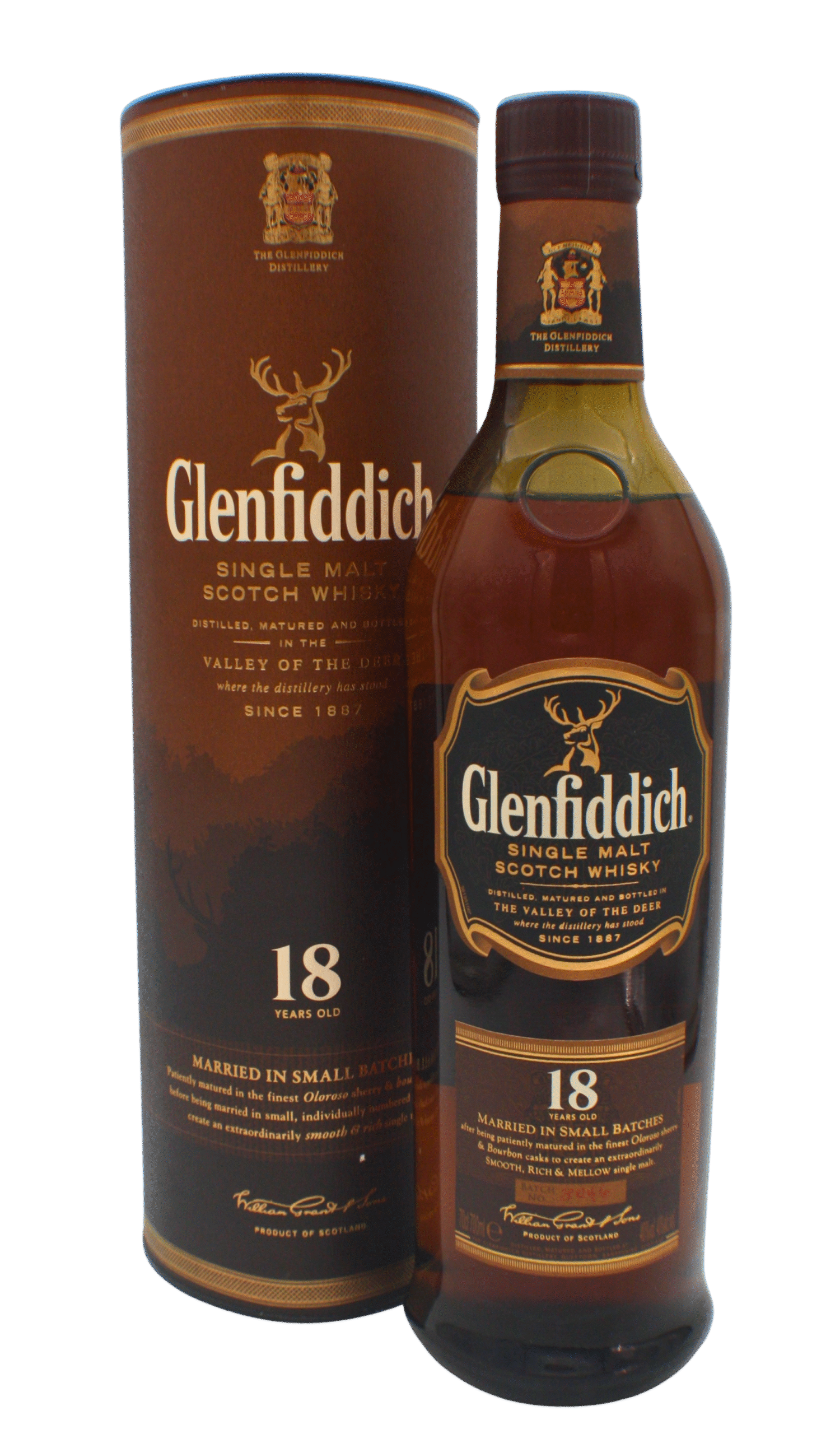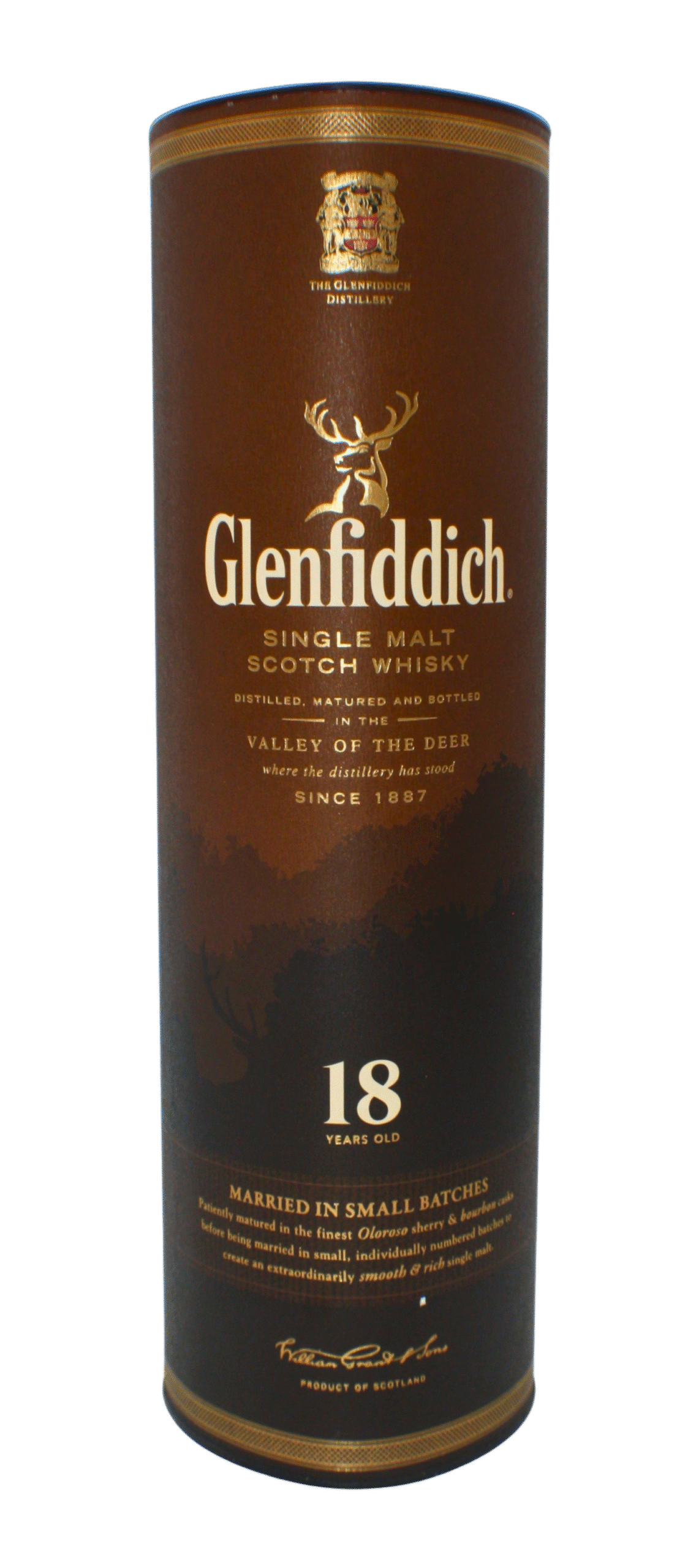 This 18-year-old Glenfiddich single malt Scotch whisky was matured in hand-selected Oloroso sherry and bourbon casks then married in small batches to achieve a harmonious character.