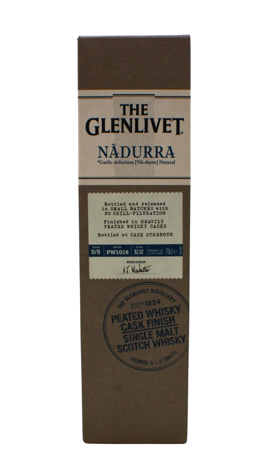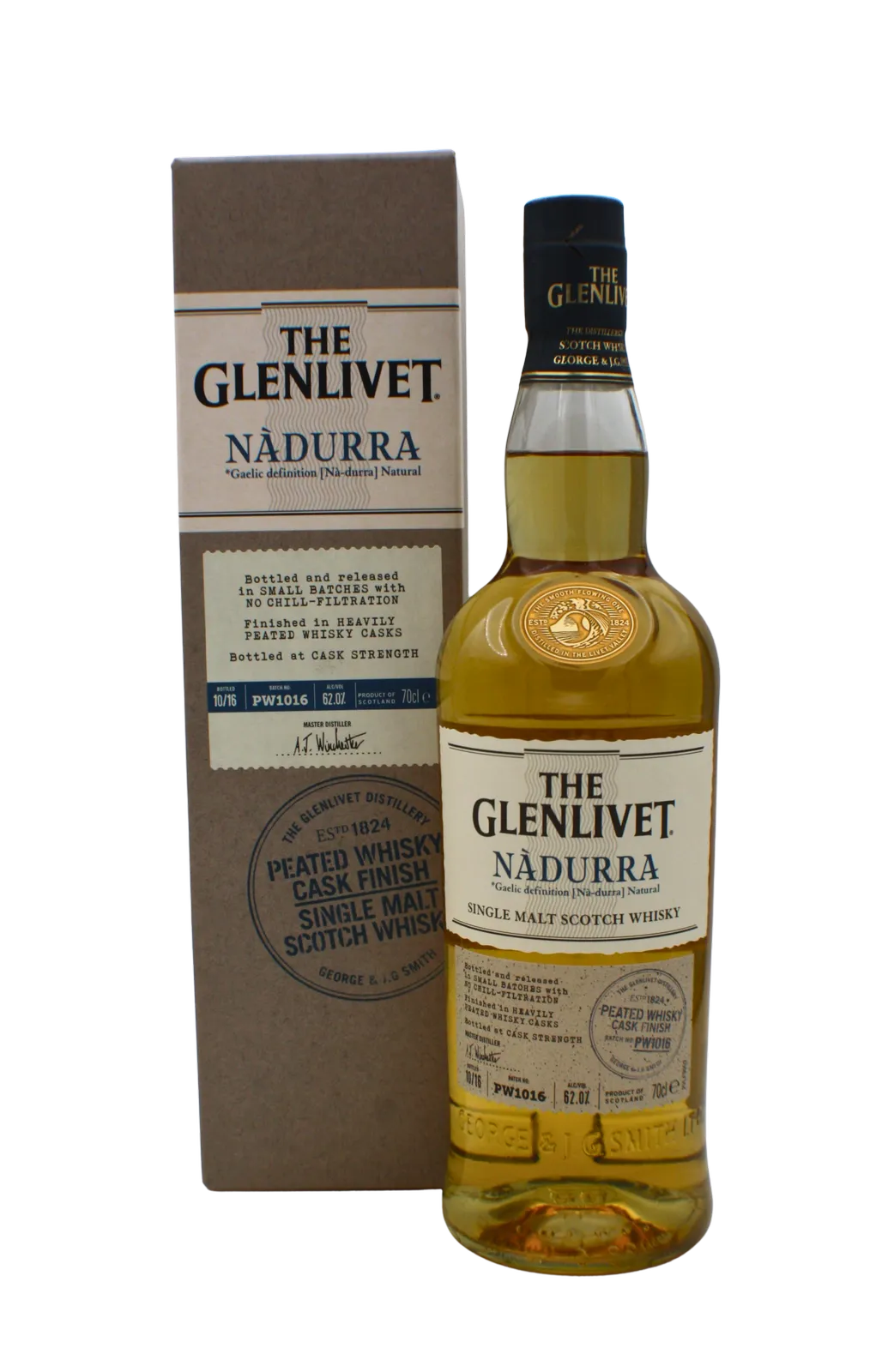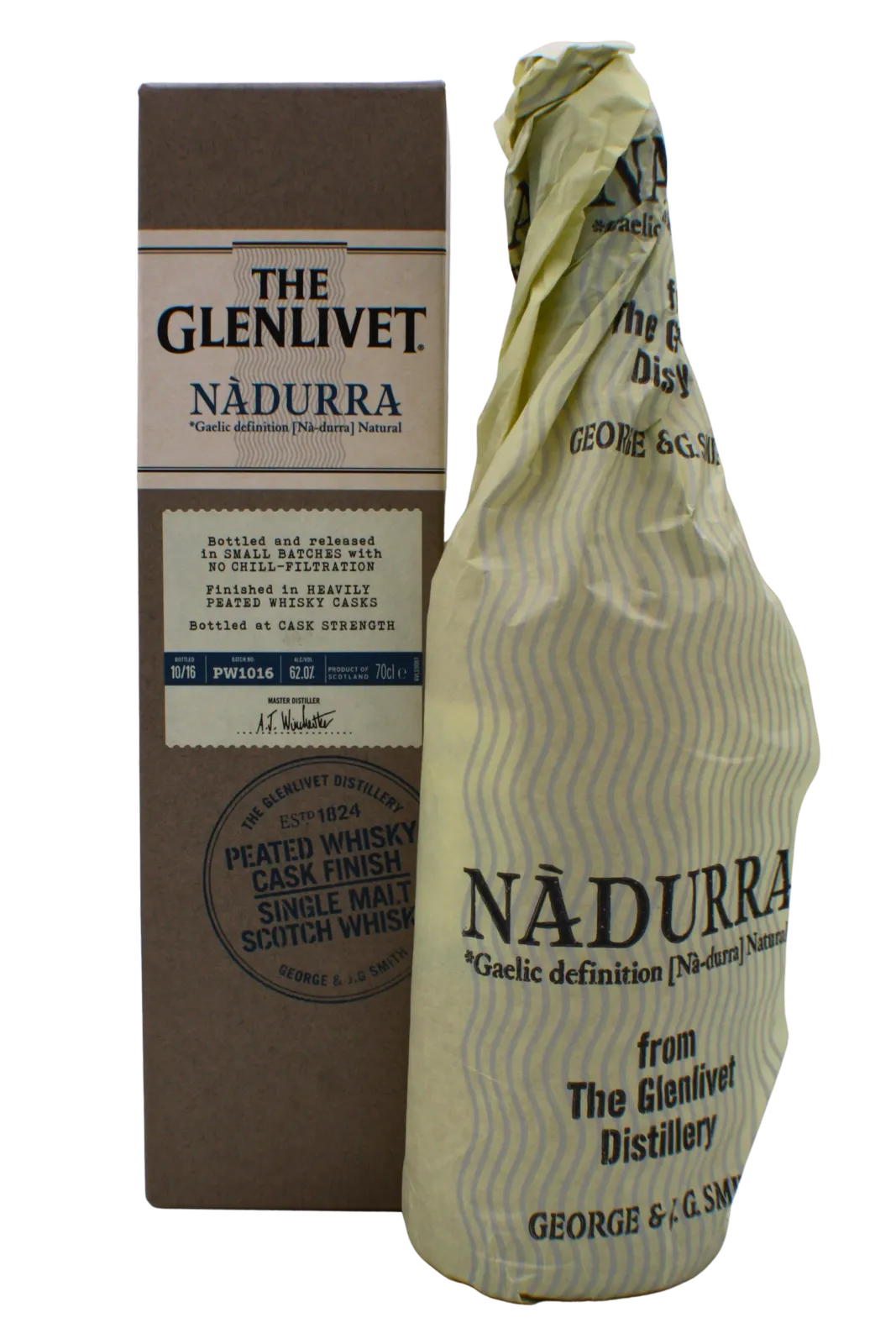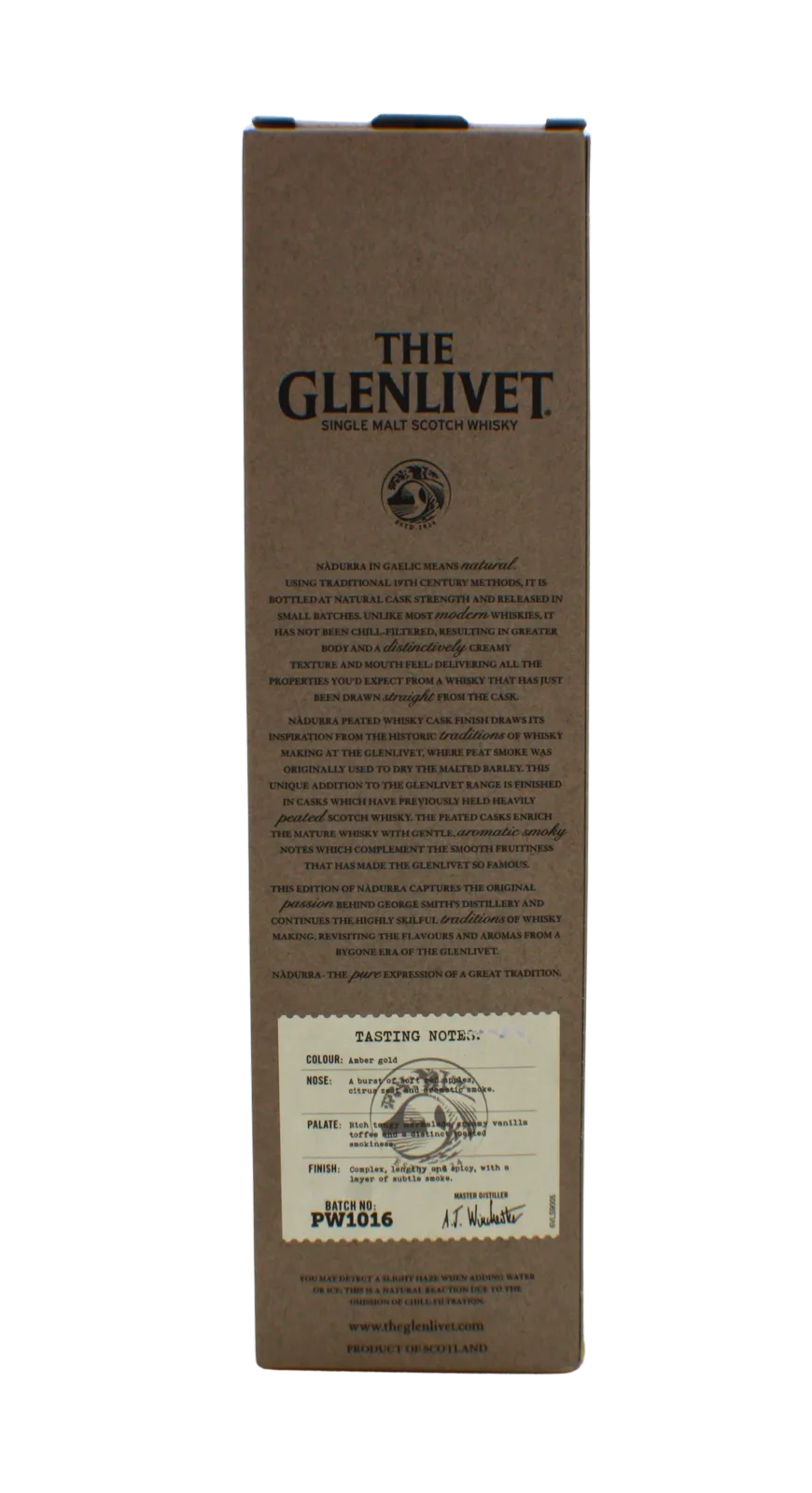 Part of the Glenlivet N?durra range this single malt was entirely matured in heavily peated whisky casks. Each expression in the series is bottled in small batches this particular one batch #PW1016 was bottled in October 2016.