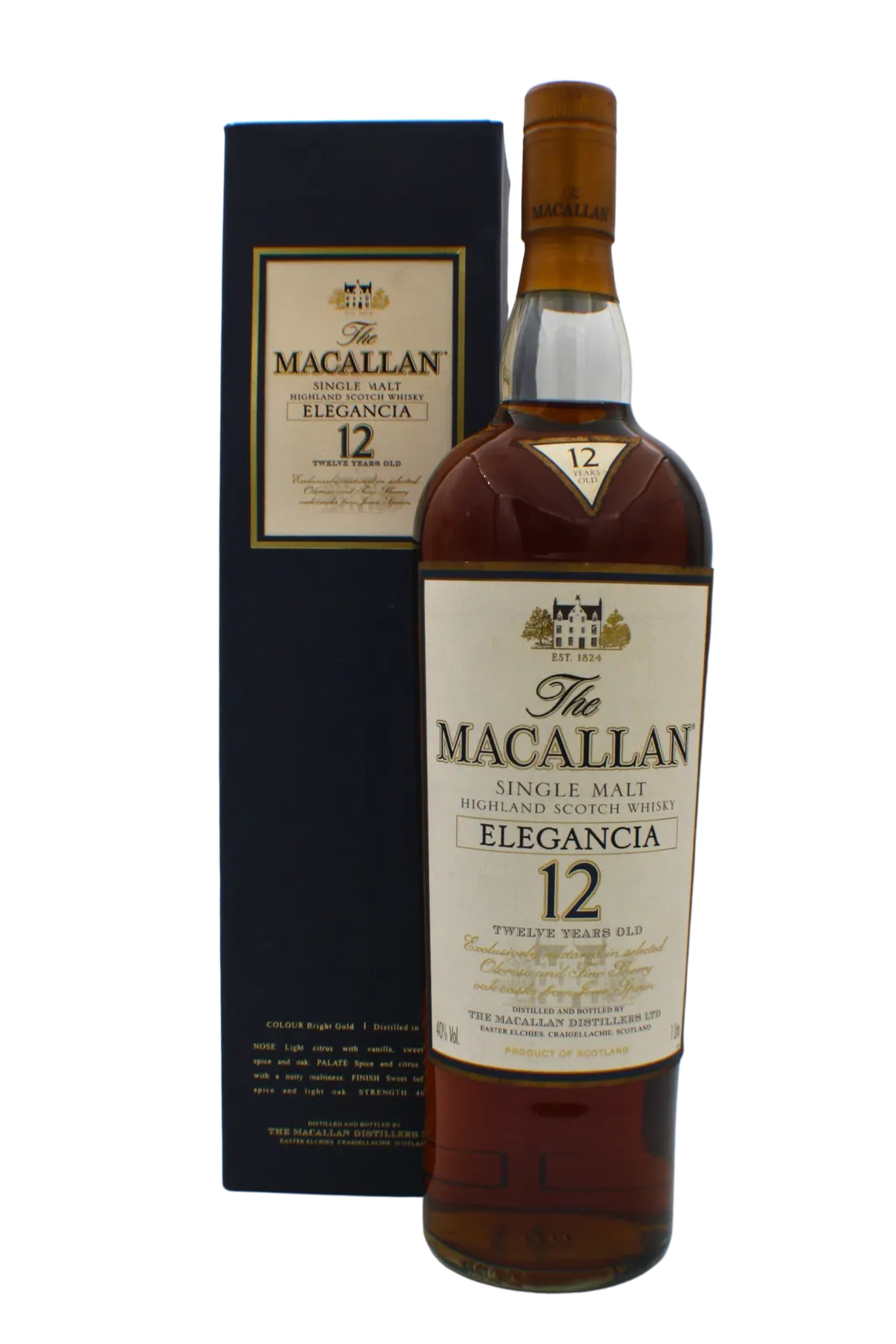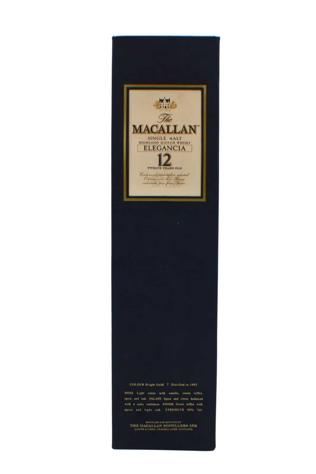 The Macallan Elegancia is a 12 year old whisky matured exclusively in Oloroso and Fino sherry casks from Spain. The whisky is distilled in 1990 and bottled in 2002 and it was reselased for the travel retail market only.