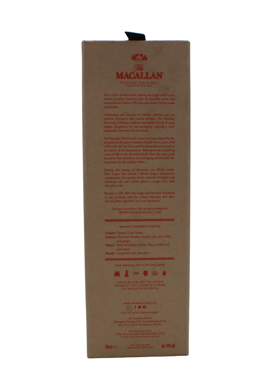 The Macallan Harmony Rich Cacao is a limited annual release and its part of The Harmony Collection. This is the first release and is a collaboration with pastry chef Jordi Roca of restaurant El Celler de Can Roca and his famous chocolate factory Casa Cacao. The whisky matured in both sherry seasoned and bourbon casks. The sustainable packaging comes from discarded cacao husks.