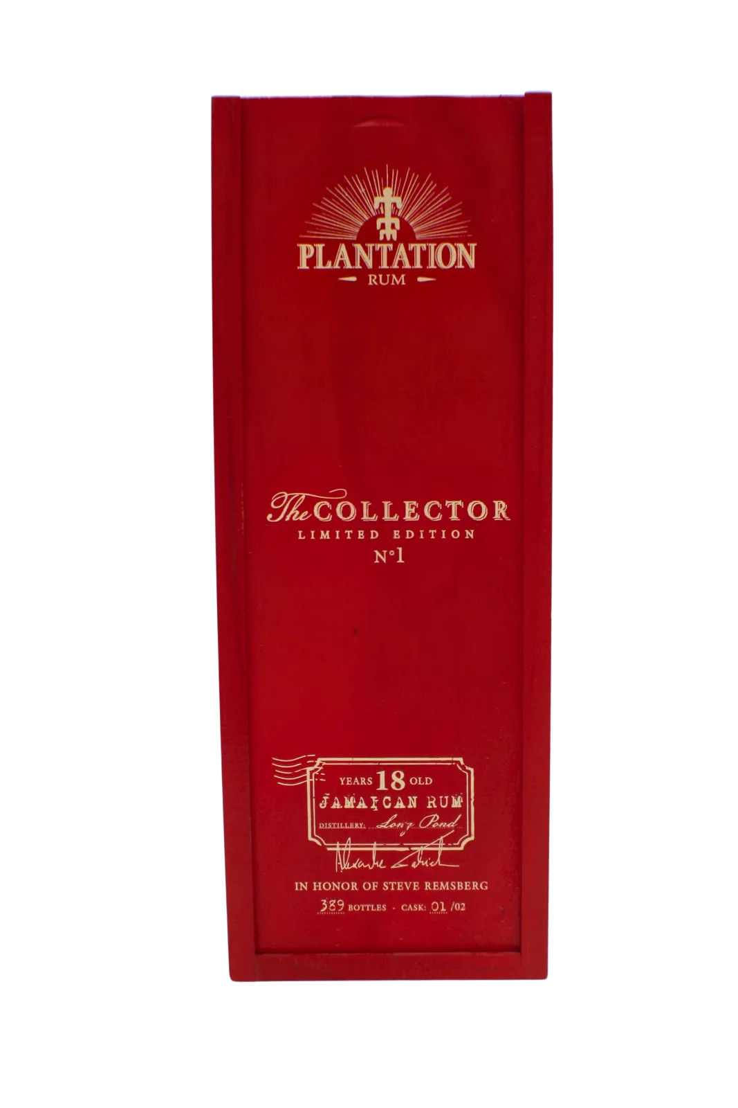 This very limited edition Plantation rum bottling was created to honour Steve Remsberg nicknamed “The Collector”. The spirit is a blend of two vintages the one in 1996 and the other the 2000 from the Long Pond distillery. Using both pot still and column still for distillation the spirit matured for 17 years in Bourbon casks in a tropical enviroment and an additional year in Cognac casks in Maison Ferrand in France. This bottle is limited to 389 bottles worldwide and this is number 156.