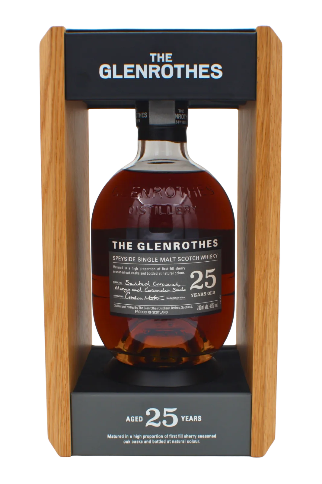 This Bottle of Glenrothes 25 year old matures mainly in first fill sherry seasoned casks and come in a wooden presentation box.